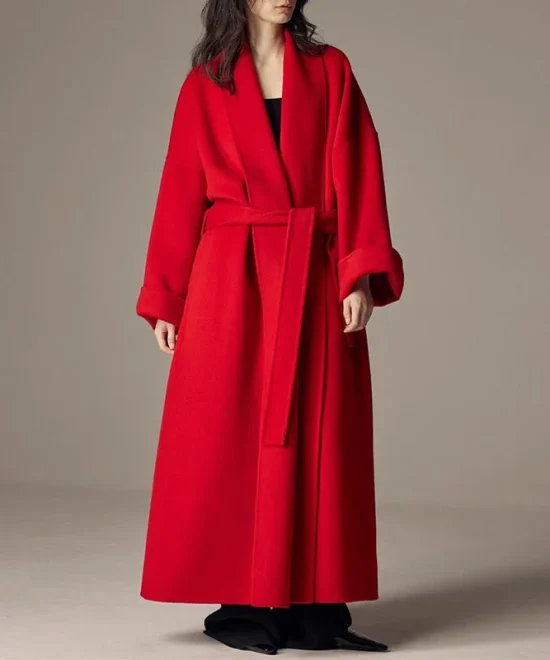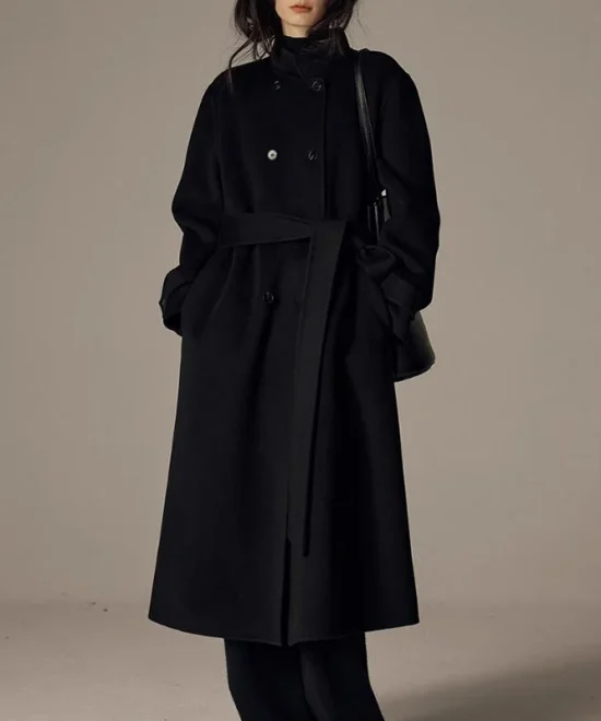 The double-faced wool construction offers a flawless finish on both sides without heavy lining, creating a lightweight yet insulating outerwear piece. Designed in a luxury oversized silhouette, the coat drapes beautifully while allowing comfortable layering. The matching waist belt enhances versatility—cinch it for a tailored look or wear it open for effortless sophistication.