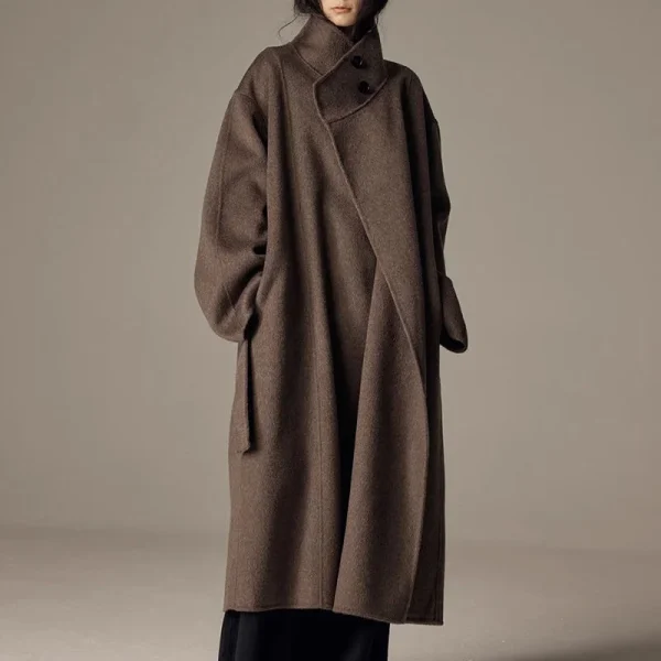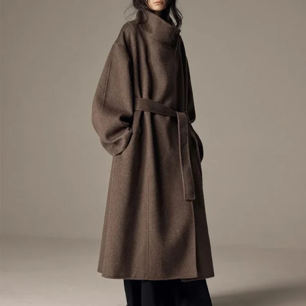 Women’s Double-Faced Camel Hair Wool Coat – Luxury Oversized Long Belted Winter Coat in Dark Brown | OGNLS